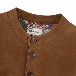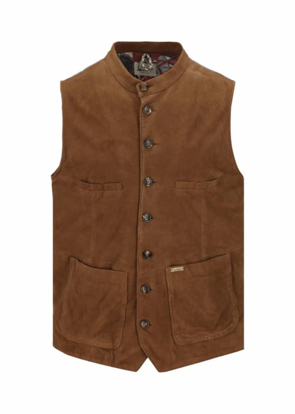 - Diese einreihige, hochgeschlossene Weste im Regular Fit besteht vorne aus echtem Veloursleder und hinten aus Walk. Das Leder wurde so behandelt, dass es einen natürlichen Vintage-Effekt erhält. Das Satin-Innenfutter trägt den exklusiv für Luis Trenker designten Ethno-Print im Patchwork-Stil.